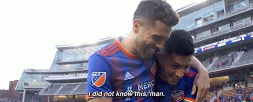 FC Cincinnati players Emmanuel Ledesma and Leonardo Bertone celebrate, with Ledesma saying 'I did not know this, man.'