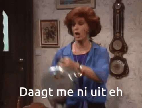 Carmen from Oppassen!!! holds a pot and defiantly says, 'Daagt me ni uit eh' to a man.