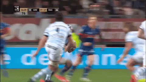 Intense rugby action featuring FC Grenoble, with players tackling and running with the ball during a match.