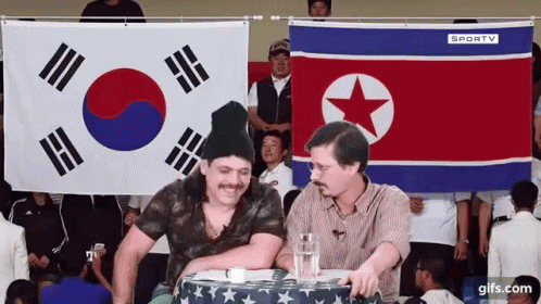 Two men at a table with North and South Korean flags, a "coverage failure" moment from Fdc tvquase.