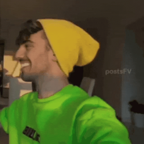 Fede Vigevani smiling, wearing a green shirt and yellow beanie, showcasing his handsome and charming demeanor.