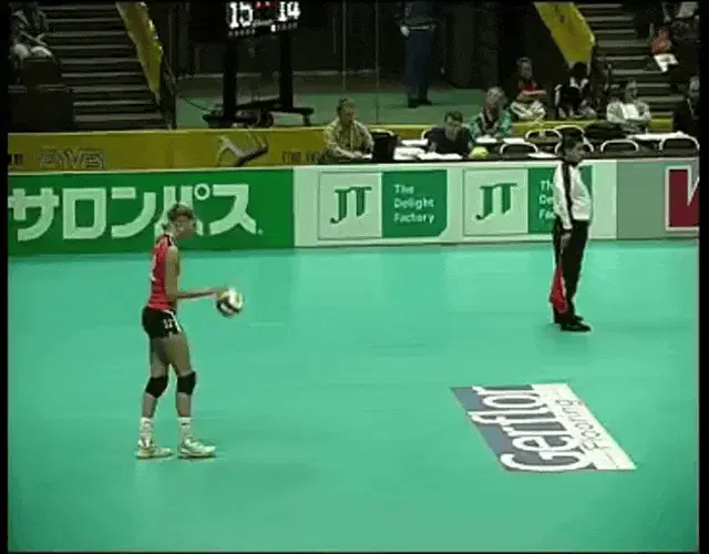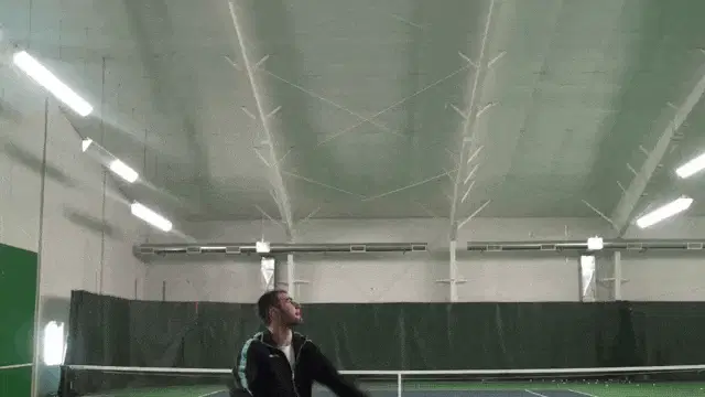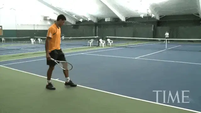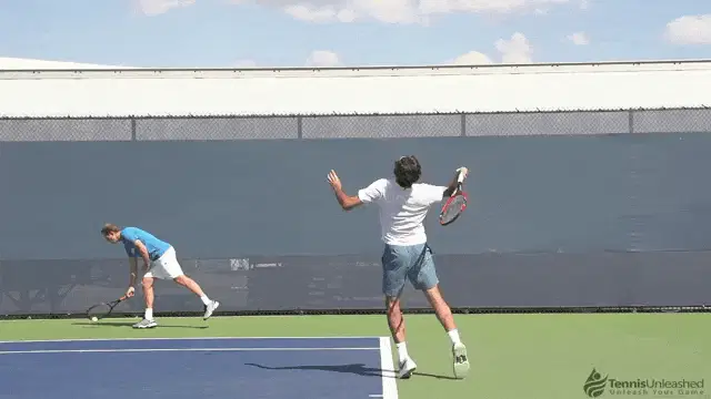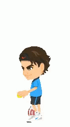 Animated character Federer performs a serve sequence, holding a racquet and ball.
