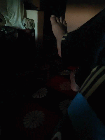 Person's feet resting on a red and black floral blanket with white flower designs.