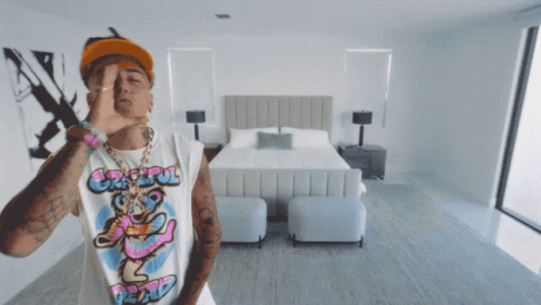 Feid in his music video, wearing a colorful shirt and orange hat, making a hand gesture in a modern room.