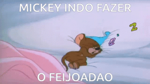 Jerry sleeps soundly in bed while text suggests Mickey is off to make a big feijoada, a classic Brazilian dish.