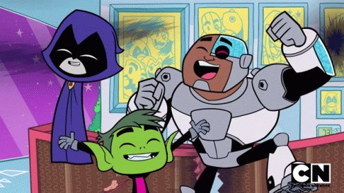 Raven, Beast Boy, and Cyborg from Teen Titans Go! are cheerful and excited, celebrating together.
