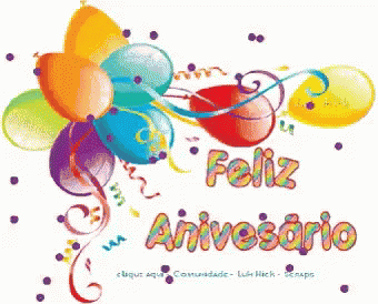 Animated greeting card with 'Felicidades Happy Anniversary' message, adorned with colorful balloons and streamers.