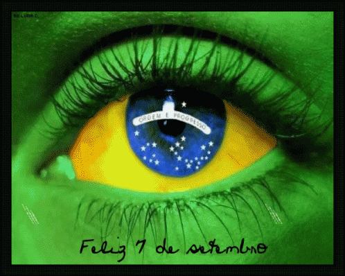 A vibrant close-up of an eye with the Brazilian flag colors, celebrating Feliz 7 de Setembro.