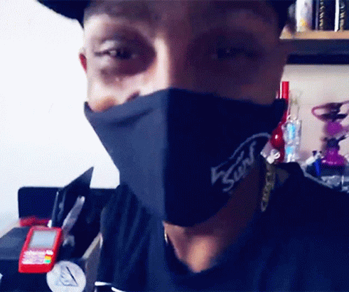 Alek and Everson Zoio reveal a happy smile after taking off their mask in what appears to be a shop.