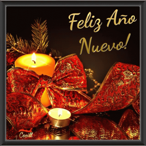 A warm 'Feliz Año Nuevo' greeting card featuring glowing candles, elegant red and gold ribbons, and festive pine accents.