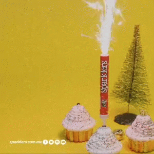 Celebrate the New Year with Sparklers Mexico! Festive cupcakes and a sparkling fountain candle on a vibrant yellow background.