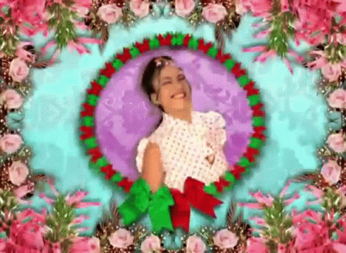 Mara Escalante as Maria De Todos Los Angeles, joyful and lively in a festive, floral frame.
