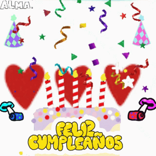 Animated birthday celebration with hearts, candles, confetti, and 'Feliz Cumpleaños' text for Alma.