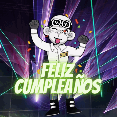 Cartoon monkey ZHOT celebrates a splendid birthday party with confetti and laser lights, wishing 'Feliz Cumpleaños'.