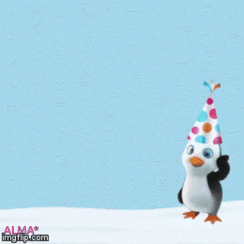 Animated penguin in a party hat celebrates a birthday with balloons and the message 'Feliz Cumpleaños a ti'.