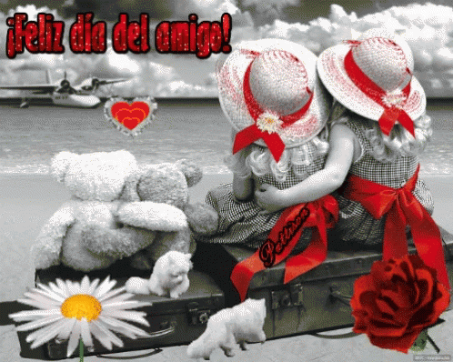 Two young girls with teddy bears sit on a suitcase, celebrating 'Happy Friend's Day' with a heartfelt message.