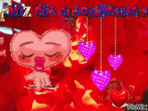Animated heart blows a kiss with the message 'Feliz día a todos' (Happy day to all) on a red background.