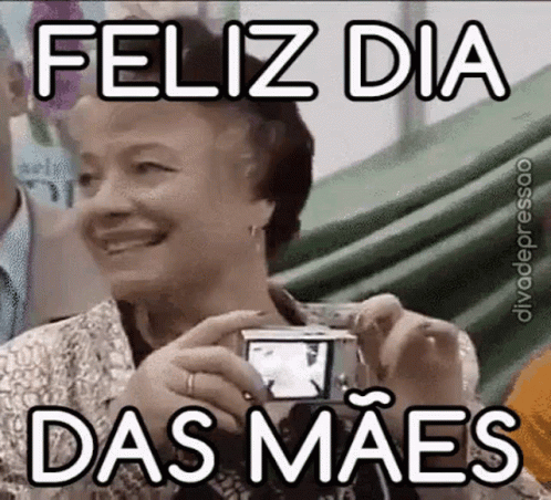 An older woman smiles while holding a camera, seemingly taking a picture of herself, with 'Feliz Dia Das Mães' text overlay.