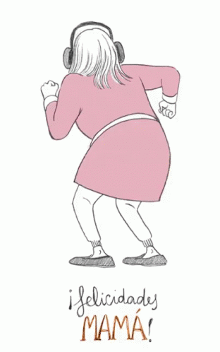 A drawing of a mom with headphones dancing joyfully, celebrating Mother's Day with the text 'Happy Mother's Day, Mom!'.