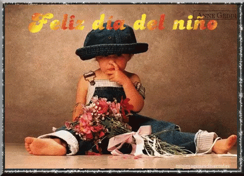 A young boy sits on the floor holding a bouquet of flowers, with the text 'Feliz Día Del Niño' (Happy Children's Day).