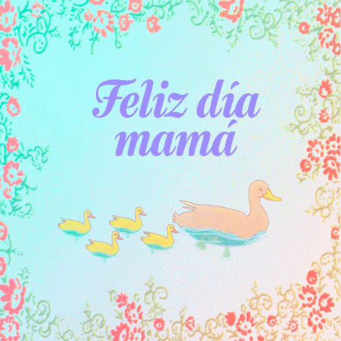 An animated greeting card wishing 'Feliz Día Mamá' (Happy Mother's Day) with a mother duck and ducklings.