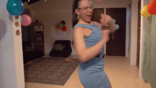 A woman from Enchufe Tv happily dancing in a living room decorated with balloons.