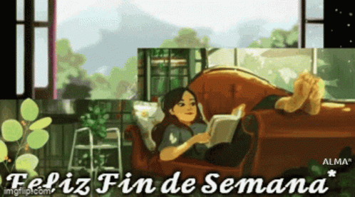Animated scene of a woman relaxing on a couch reading a book, with a message about enjoying time.