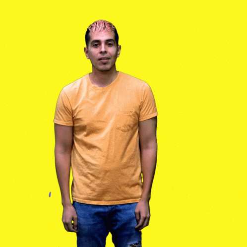 A smiling man with pink hair gives a double thumbs up on a bright yellow background with 'Jueves' text.