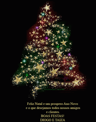 A festive Christmas tree with a holiday greeting from Diogo and Taiza, wishing friends and clients a Merry Christmas and a Happy New Year.
