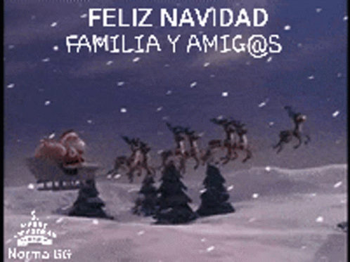 Animated Santa Claus flying in a sleigh with reindeer over a snowy landscape, wishing "Merry Christmas Family and Friends."