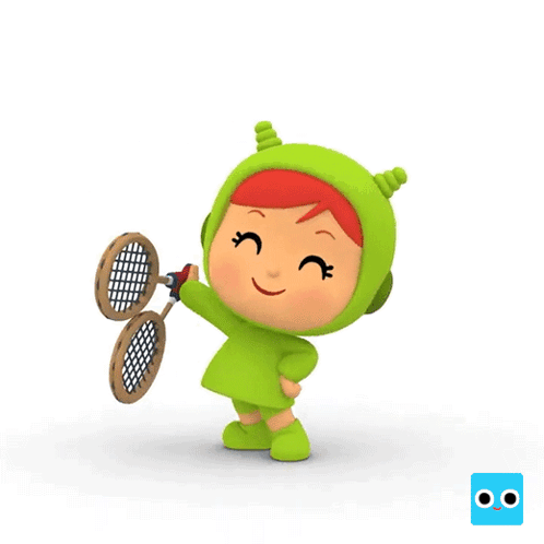 Nina from Pocoyo, a cheerful cartoon character in a green outfit, happily holding a badminton racquet.