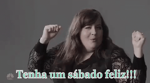 A woman with long dark hair celebrates with raised fists, wishing everyone a happy Saturday.