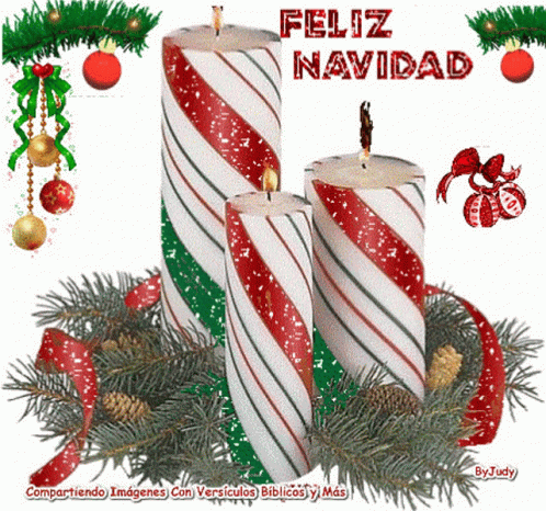 A festive Christmas greeting card featuring striped candles, pine branches, and ornaments.