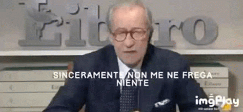 Vittorio Feltri, the Italian journalist, sits in front of a sign stating 'Sinceramente Non Me Ne Frega Niente'.