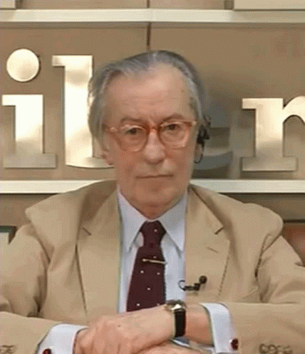 Vittorio Feltri, an Italian journalist, sits thoughtfully, occasionally glancing down, with 'liber' in the background.