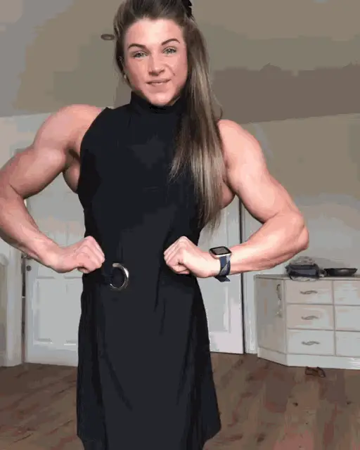 Muscular female bodybuilder proudly flexing her bicep, showcasing her impressive physique and strength.
