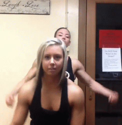 Two female bodybuilders, one in front of the other, flex their muscles and pose for the camera.