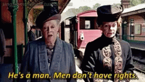 Two women on a train platform, one states, 'He's a man. Men don't have rights,' in a humorous clip.