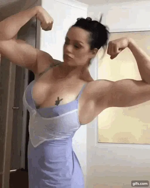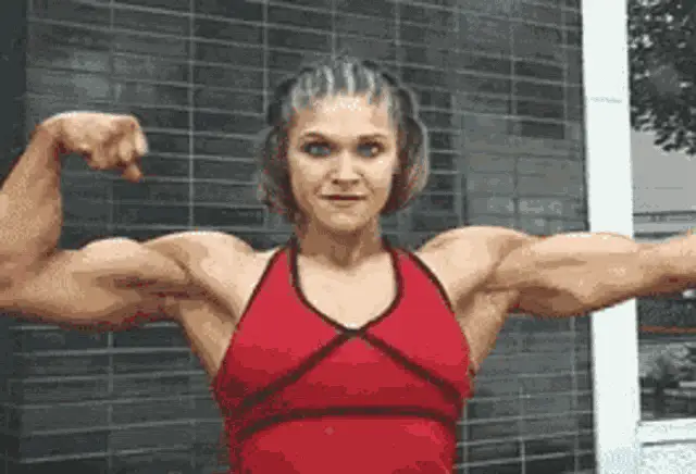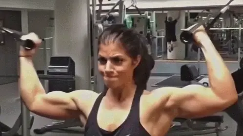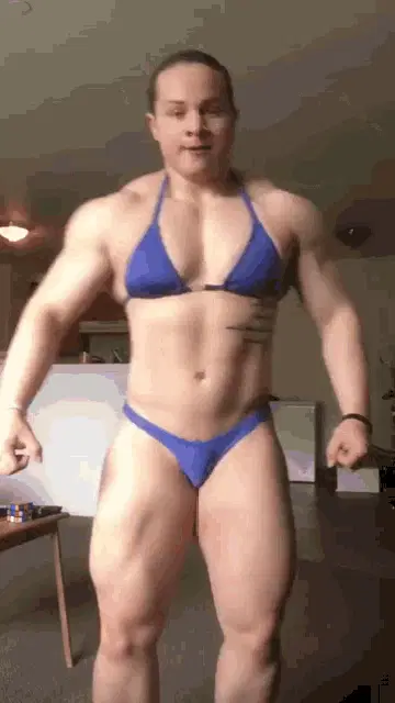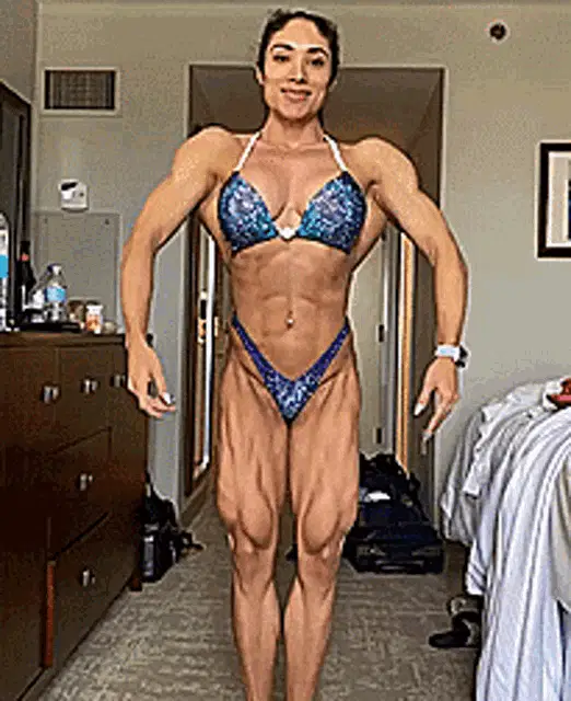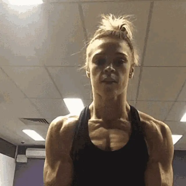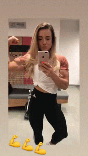 A muscular woman, Femuscle B567, takes a mirror selfie, flexing her impressive biceps in a gym setting.
