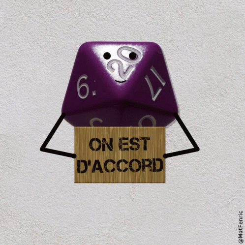 Animated purple D20 dice with arms and legs holds a sign saying 'On Est D'Accord' (We Agree).