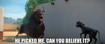 Ferdinand the bull and Raf the goat interact, with Raf excitedly exclaiming, "He picked me. Can you believe it?"