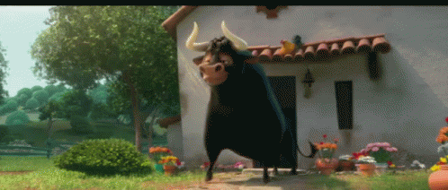 Ferdinand The Bull performs a big morning stretch and yawn in front of a charming house, surrounded by vibrant flowers.
