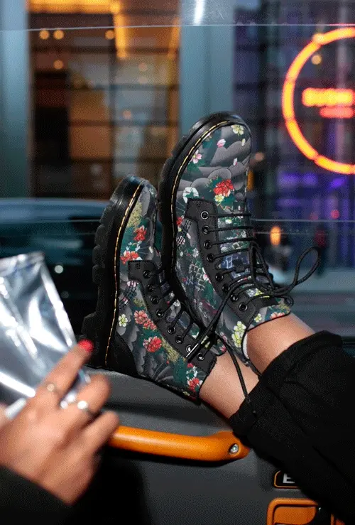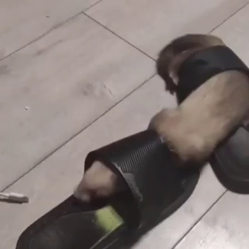 A playful ferret attempts to get inside or move a black slide sandal on a light wooden floor.