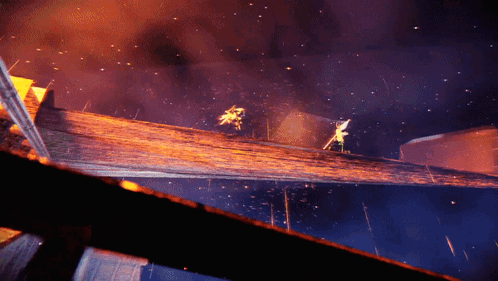 a person standing on top of a wooden beam with a sword