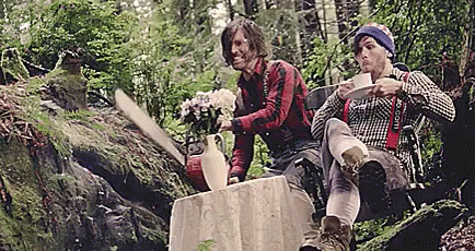 Ff5 and another lumberjack in a forest. One drinks tea, the other uses a chainsaw, leading to a surprising spray.