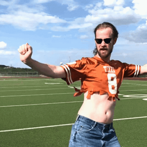 Ffmanbun Gniusthemc dances on a football field, wearing a Texas Longhorns crop top jersey.