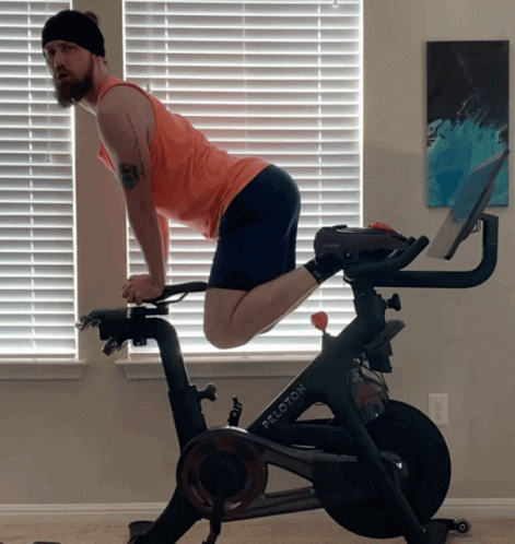 Ffmanbun Gniusthemc performs the Buss It Challenge on a Peloton bike, striking a funny pose.