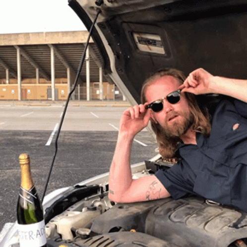Bearded man with a manbun adjusts his sunglasses while leaning out from under a car hood in a parking lot.