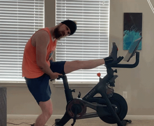 Ffmanbun Gniusthemc stretches his leg on a Peloton exercise bike, preparing for a workout.