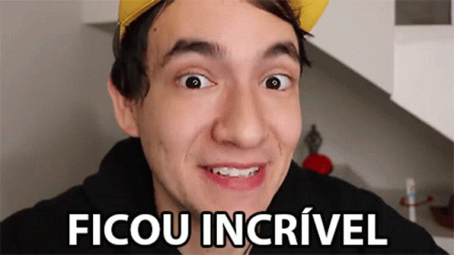 Gabriel Dearo, wearing a yellow hat, smiles excitedly with the caption 'Ficou IncrÃvel' (It's Amazing).